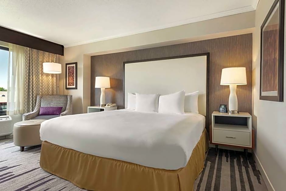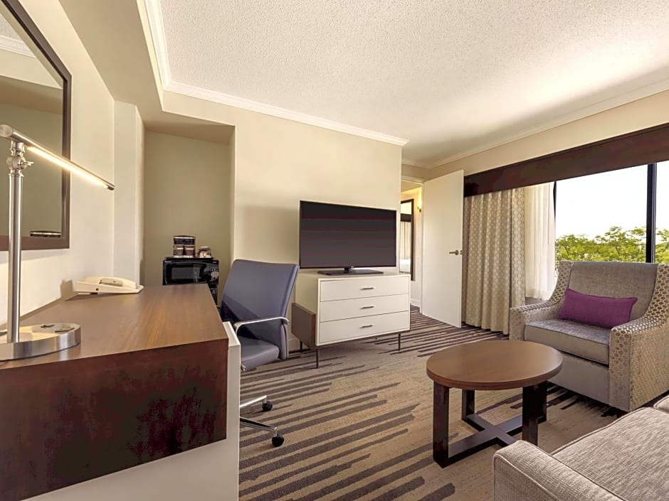 Air-conditioned room including a seating area and a flat-screen TV. It has a large desk with an ergonomic desk chair. The bathroom is stocked with Neutrogena toiletries.